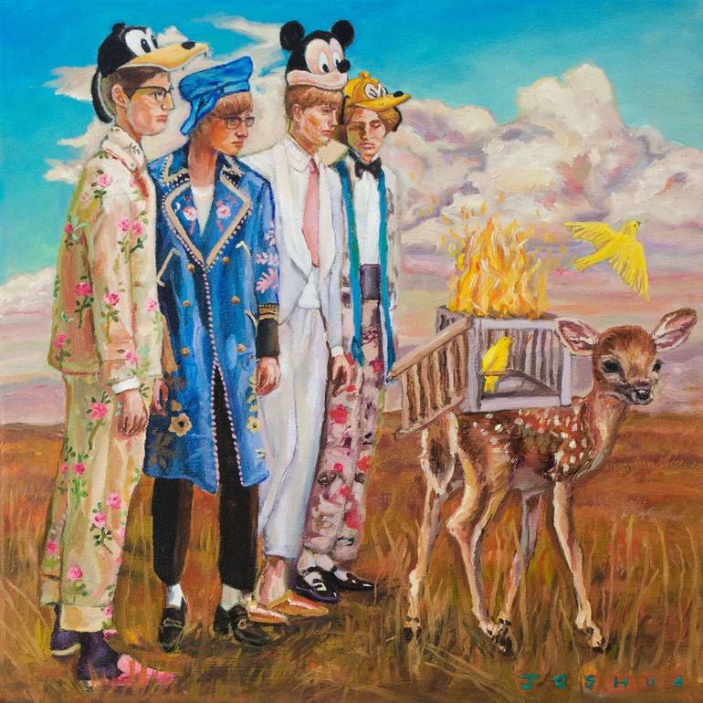 ROMANTIC ESCAPISM fine art paintings channeling nostalgia and belonging. My work stems from exploration of life’s natural happiness and challenges. Depicting an illustrated portrayal of organic, sensitive, thoughts and narratives alongside pop inflicted, vibrant imagery. I aim to look into the realness of human nature, emotions and indulgences. Considering the fleeting flash of sentimental memories and conversations that can be experienced at any age. Alot of my work can be a personal reflection with time for the viewer to think about where they are in their own life and where they want to go. As someone who suffers from various invisible illnesses, I find myself as an artist intrigued by bringing out beauty from what may be seen as the opposite. Colour filled pieces, act as a cheery facade of scaffolding and cladding, over artworks that hold sincere messages to its viewers. Everyday objects get given a whimsical embellishment whilst singular portraits or groups of people swarm imagery to explore the sense of self, belonging and finding home. Nostalgic, messages of strength and positivity creep their way into my work, scratched into paint layers. Signs of encouragement - like a glimmer of sunshine hold the pieces up and encourage exploration. Using colours and subjects that feel like they are somewhat of a fleeting memory or sudden, unfiltered thought. Works experiment with media application and process - binding the line of realism, figurativeness and abstract. My eyes seem to see everything more saturated and vibrant which help lead my work into almost a dream state. Aspects of my work hold that of organic childlike qualities - how young draw freely or say things without filter - just intuition. Little notes and thoughts are found among my work. Listed in 35 Under 35 – Rising Stars (Artists to invest in) – Saatchi Art Joshua’s artwork is featured in the homes of worldwide Art Collectors and aims to bring them joy and inspiration whenever they view it. "Joshuas paintings and photos help embellish a feeling of nostalgia, romance, dreams and freedom into the viewers mind." My imagery takes inspiration from many things I love including music and mid century modern (design, architecture, fashion) - which are significant subjects in my artistic identity. My love for fashion, graphics and pop surrealism has meant my artistic style has been able to progress and branch out to new methods of image making.