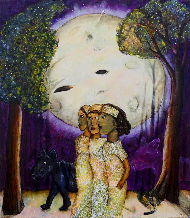 This painting represents a dreamy myth of woman walking through the night just at the edge of your vision.