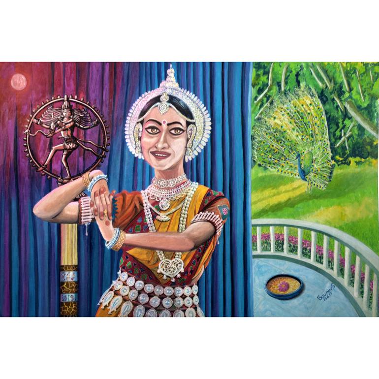 The Nartaki lives in a world of dance. Lord Natraj is her supreme guide. In her great devotion to dance lies her strength to create this atmosphere of great beauty. As she dances and dances, the whole world dances with her. This is symbolized by the peacock which too is dancing with Nartaki, and co...