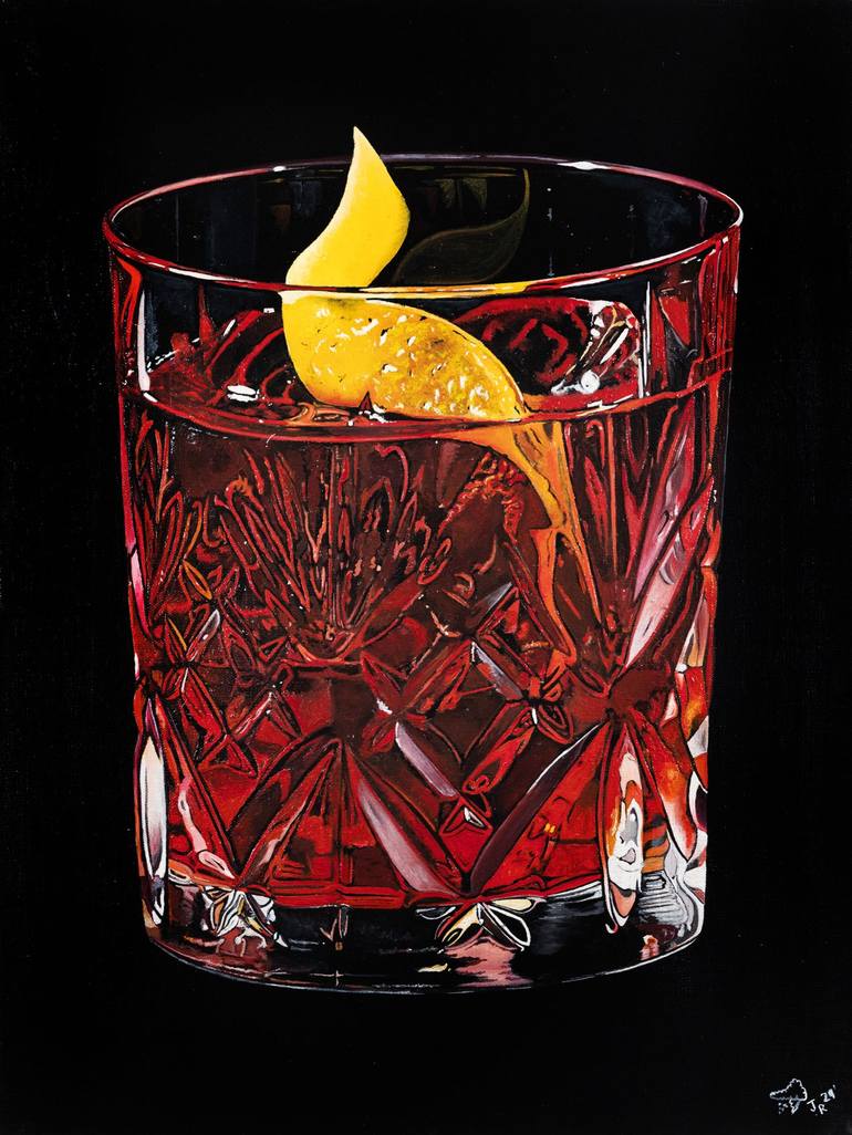 The Negroni is a classic cocktail with equal parts gin, campari, and sweet vermouth, known worldwide and enjoyed by nearly everyone, this piece captures intricate glassware and the iconic ruby red glow of the drink.