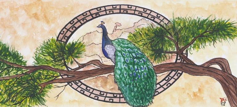 Although I like animals, i do not paint them. I have only two paintings with birds. This is one of them. Inspired for some peacock I saw free in a park in Spilt in Croatia. It was an amazing view. Really around six of them or more in the trunks of the trees or walking and even I saw flying them from...