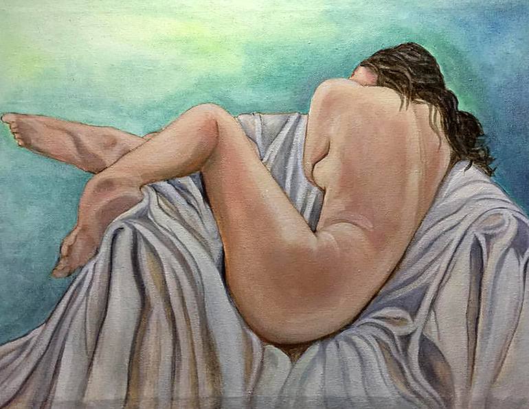 Figurative nude. A figure study of a lady on the sofa. Oil on canvas.
