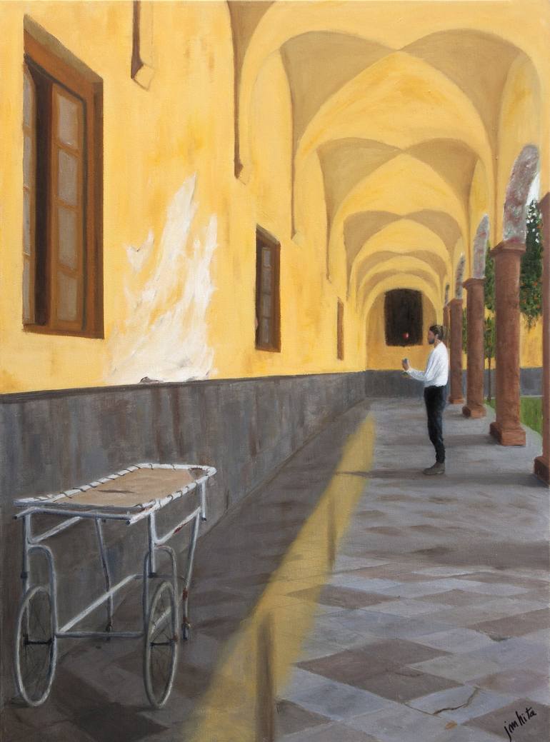 The place is inspired by the really old San Juan de Dios hospital in Granada, as the author remembers it when he visited it many years ago. It is currently restored. The scene takes place in a side corridor in the porticoed courtyard of an old and poorly maintained building. In the foreground, a old...