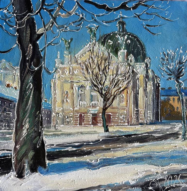 This painting appears to depict a European winter cityscape, possibly featuring a grand opera house or historic building, covered in snow. The subject matter is an elegant blend of architecture and seasonal atmosphere, creating a scene that feels both nostalgic and inviting. The painting’s bold, tex...