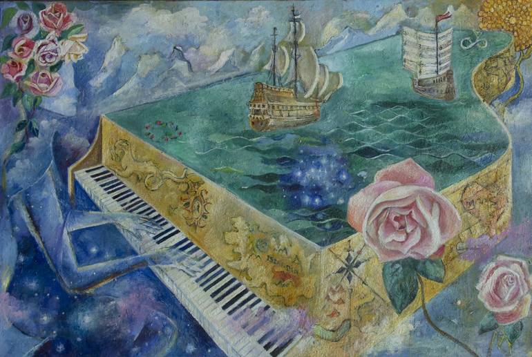 The painting was inspired by listening to a heartfelt lovely singer playing piano and I wondered if he could see ships and stories inside his piano. And maybe the whole universe was created by someone's song.