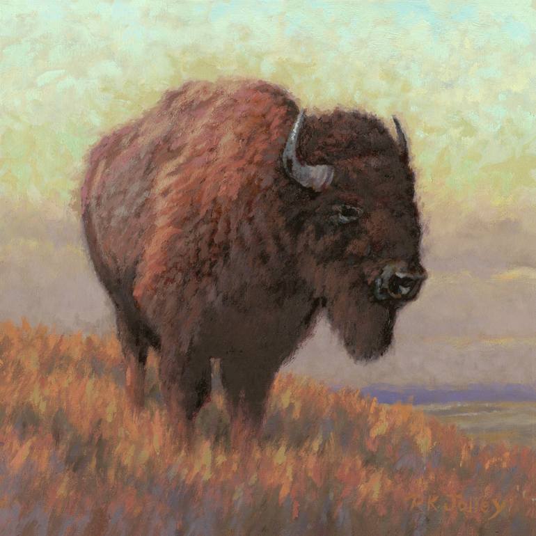 A solitary bison stands watch on a prairie knoll. Using loose brushwork, the scene is painted in the impressionist style.