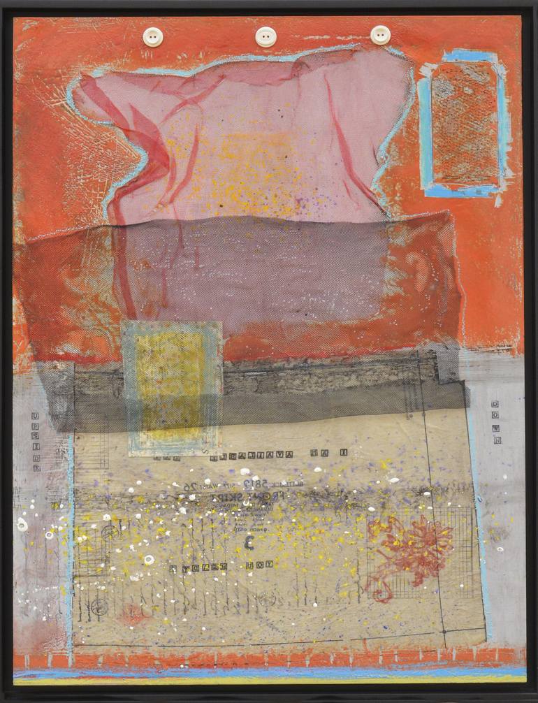 A mixed media encaustic on panel with dress patterns and mesh. It has thrown wax which is dramatic (and dangerous!), quiet and busy moments, drama, intrigue and complex mystery. It is both humorous and serious, and pairs well with another painting here called the Fisherman's Wife.