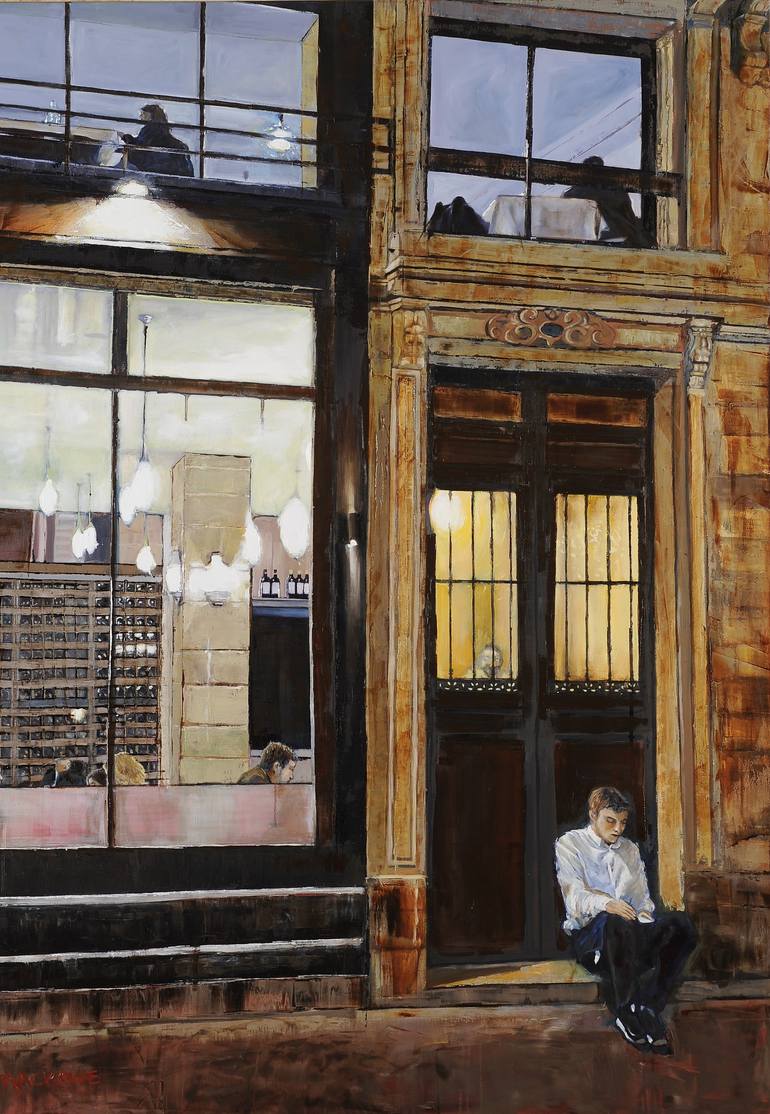 In ''La Pause'' a solitary waiter takes a tranquil break on the restaurant steps against the backdrop of classical Bordeaux architecture. The night, devoid of visible sky, is softly lit by cool white pendant lights inside, whilst amber lamp light casts a gentle glow on the waiter engrossed in his ph...