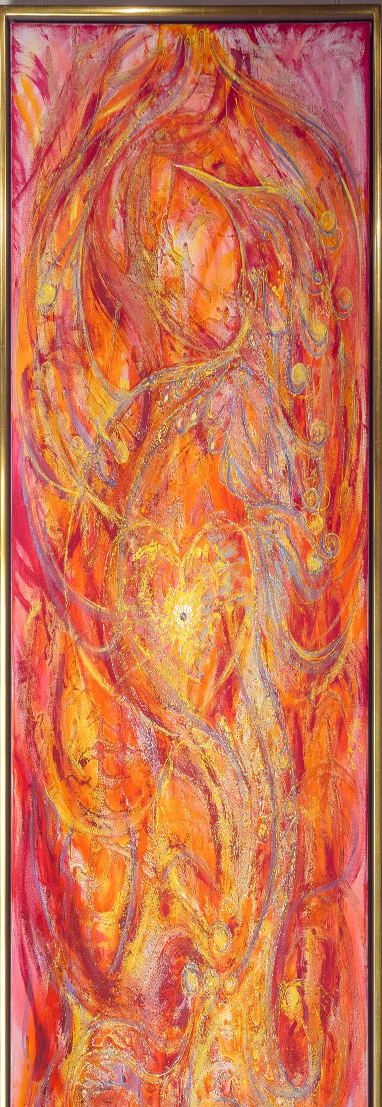 "Sitting in the fire is both the process & the initiation." - - Dr. Joe Dispenza In this painting there is a woman who dances with a phoenix (take a time to find her huged by the phoenix`s wings). They both are in a connection in their hearts - they "own" them together and she beats to the rhythm...