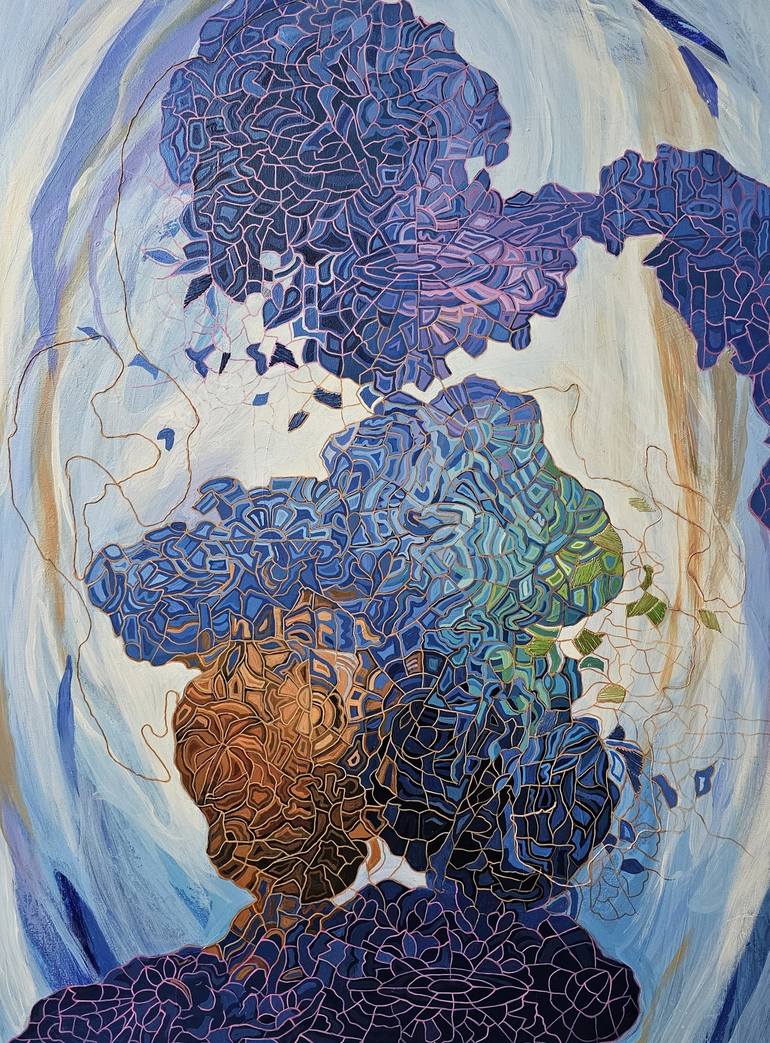 This work originates from the artist’s deep and heartfelt prayers for the well-being of a loved one. Over time, as those prayers remain unanswered, faith wavers. However, the act of praying remains, symbolizing the perseverance of hope, no matter how fragile. Acrylic and embroidery on canvas
