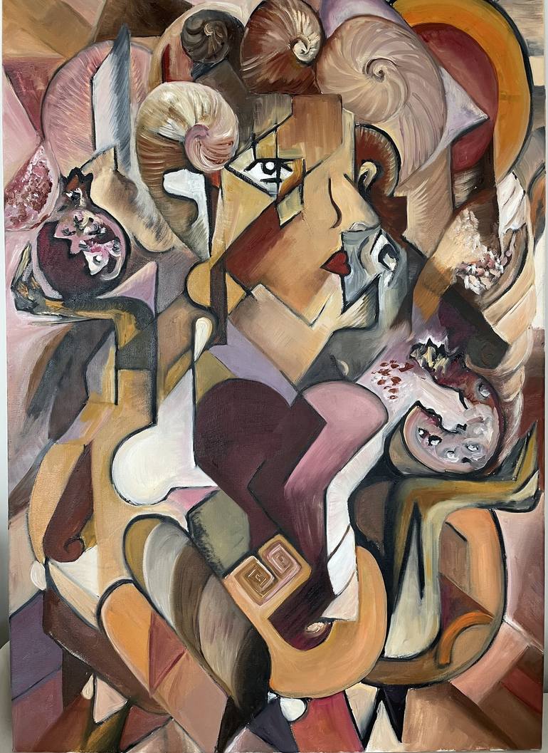"The Queen of Hearts” participated in the exhibition at "4Th Space" at Concordia University in Montreal in 2022. Painted in an analytical cubist style. It touches on the strands of issues related to immigration and identity. A feminine figure holds a pomegranate on each hand. Her look is serious, a...