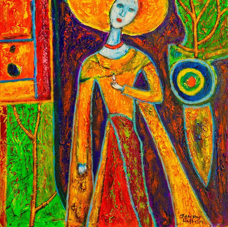 She is from my series about ladies caring for little men. It was experimental and inspired by a painting of another artist's work I saw. Unfortunately, I can't remember who it was. I was interested in creating patterns.