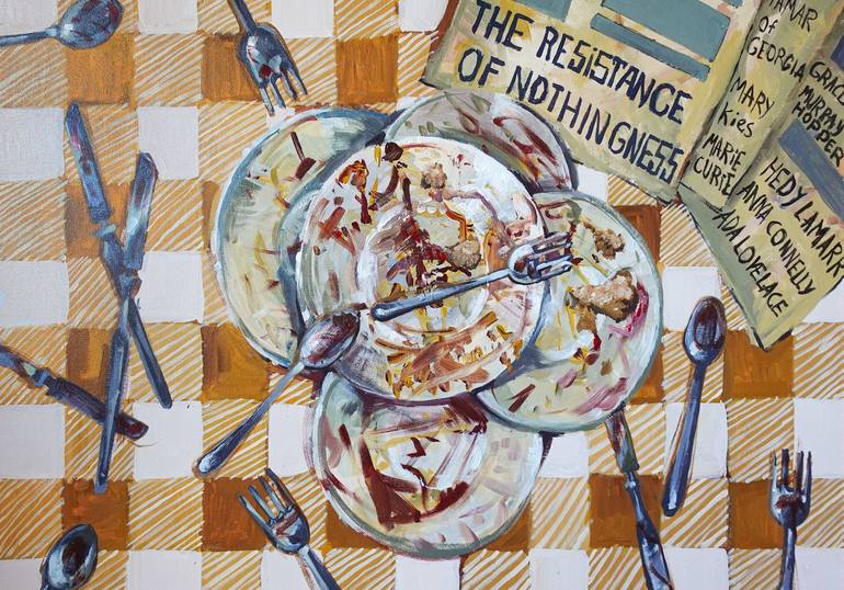 The Resistance of Nothingness is an acrylic-on-canvas painting about equality and the many things women are capable of. The dirty dishes in the painting symbolize that a woman is not obligated to stay in the kitchen — she can be an engineer, an inventor, or a scientist. The newspaper shown in the p...