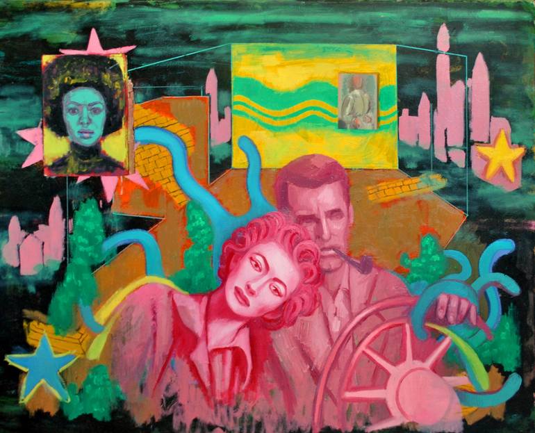A couple from the 50s on a psychedelic roadtrip. The black woman, I painted on an old bookcover. She is put on the canvas. Is she in the thoughts of the driving gentleman? Who knows..
