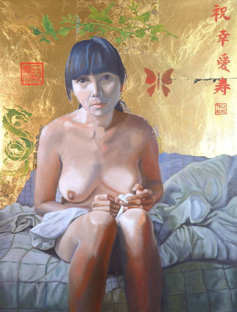 "The Secret" is an original oil painting with 24 kt gold leaf on a wood panel. The artist's unique approach blends the serenity of Chinese ancient paintings with the rich symbolism of Eastern European Iconography. This synthesis is further deepened by the use of self-portraiture as a means of explor...