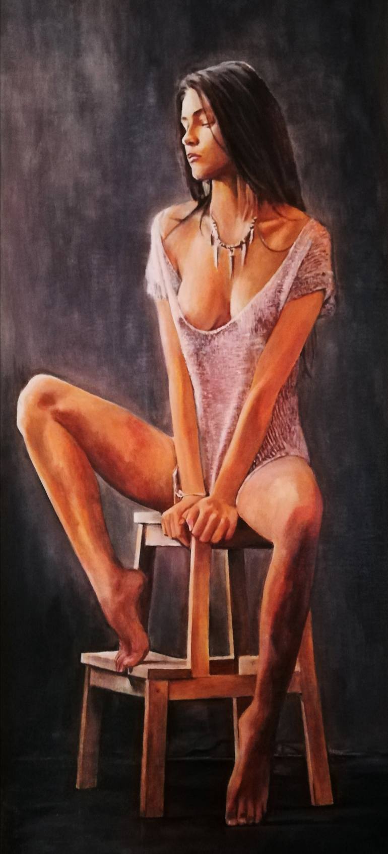 The expression of sensuality in a prose of color and sketch. A beautiful female sits partially exposed upon a stool as she looks away in a posture of seduction and temptation. The choice of color perfectly complements the theme contributing to the lure of romance. The creator has skillfully drawn t...
