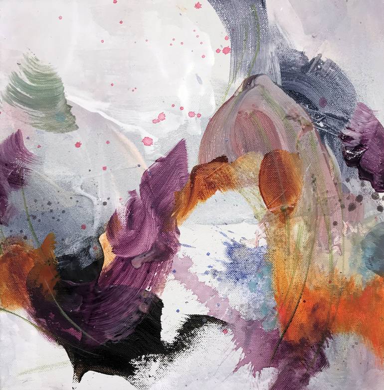 The colour palette of this artwork were inspired by a shawl. Its gestural brushstrokes, the bright and vivid colours, the subtle shades of white, grey, blue and violet convey an elegant feeling as of silk and softness.