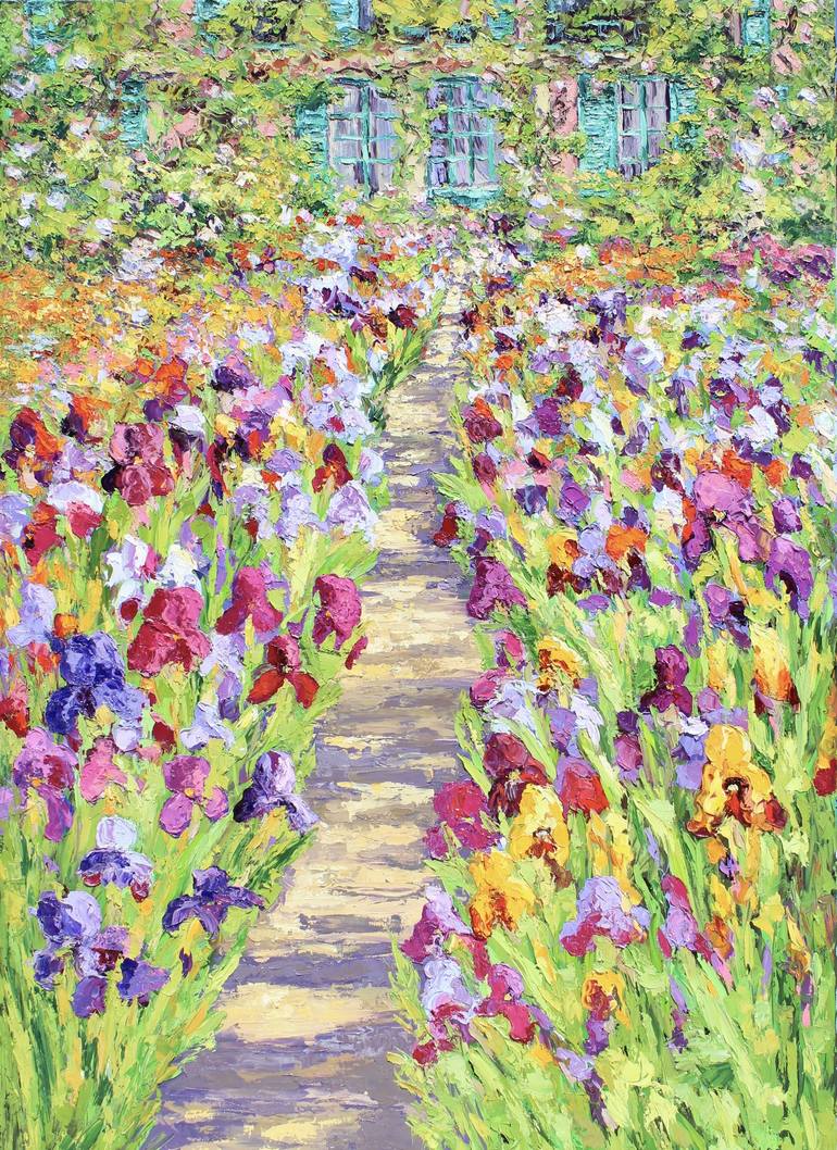 This is very much a statement painting! It will add joy and color to any room! This is a contemporary impressionist oil painting on canvas of a sunlit pathway leading through an iris garden at Monet's home in Giverny. You can see the iconic green shutters and bits of the home behind the beautiful fl...