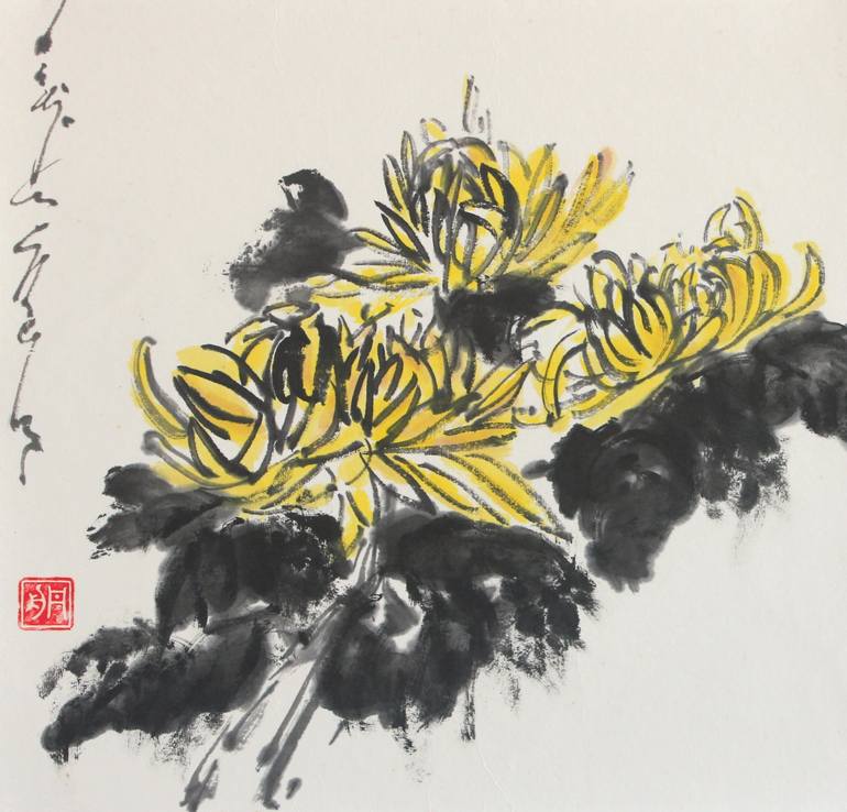 Chrysanthemum brush painting on rice paper, mounted and ready to be framed. Yellow chrysanthemum brushed in the spirit of Japanese and Chinese watercolor painting with lively brush strokes, bright color and rich ink hues.