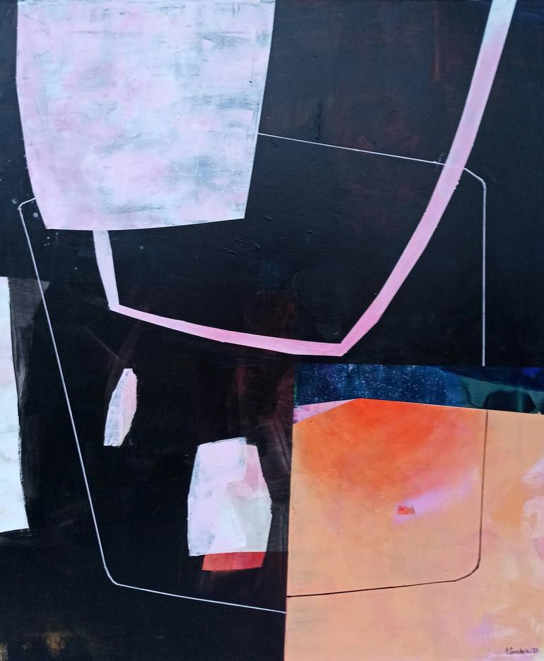 This striking painting is a masterpiece of modern, abstract art. Against a bold black background, soft pale pink shapes in various textures and thin lines weave a dynamic, visually engaging composition. The strong contrast between the black and pink elements adds to the painting's impact and makes i...