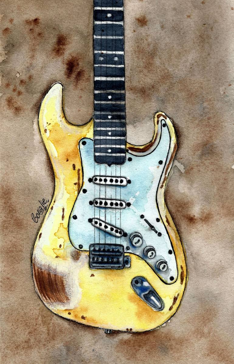 In a dimly lit pawn shop, amongst relics of forgotten dreams, sat a vintage buttercream Fender Stratocaster. Its finish, once a proud display of creamy yellow, was now a mosaic of sun-bleached patches and the faintest whiff of smoke clinging to its edges. The worn pickguard bore the scars of countle...