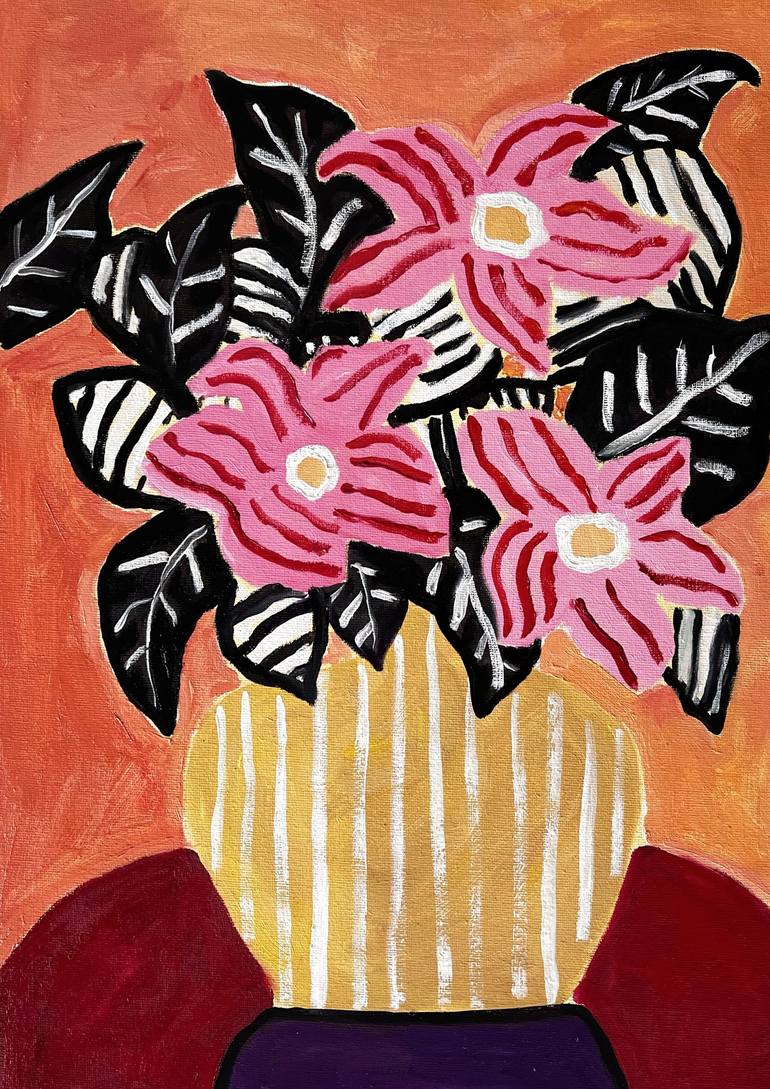 This floral design, its shape and colours made me think of Italian design. The original is on canvas paper which is 16 x 20 inches and the painting itself in about 14 x 19 inches.