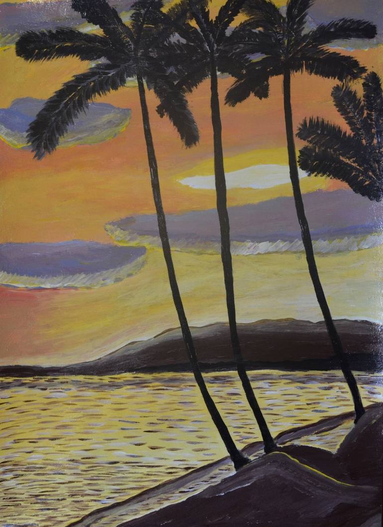 The painting shows the sunset of tropical scene. The palms are in the foreground while reflections on water vary the mark- making in the piece. The sky is blend of yellow, white, red and blue.