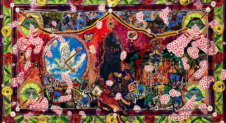This work, the second in an intended 12-part series, explores the consequences of poor decision making using fantastical collage elements from warcraft, orthodox religious iconography, and my own treasure trove or abstracted characters