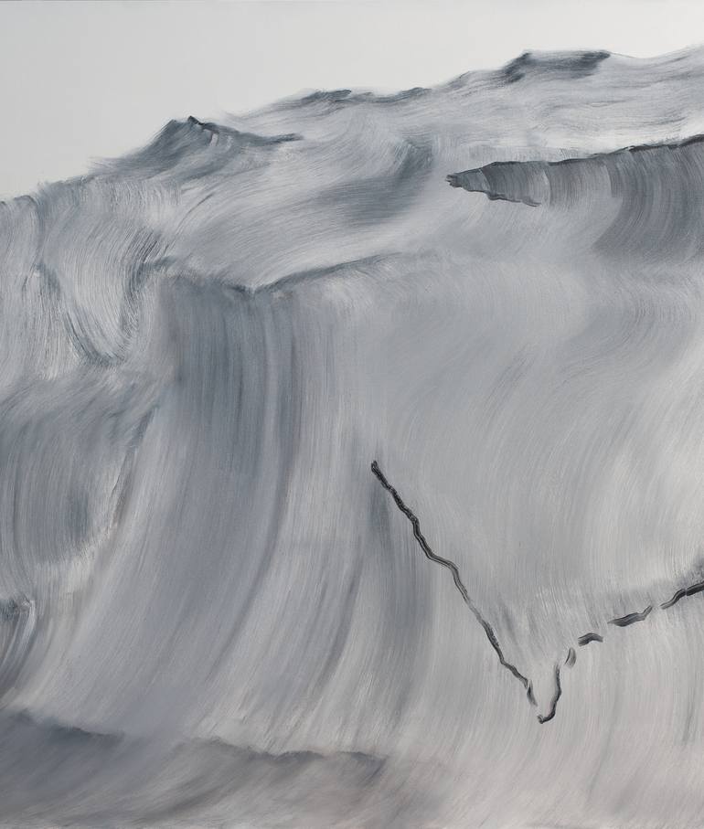 Abstract representation of a wave in grayscale. The mixture of oil paints gives a visual effect of silver color. The painting is part of a Twin series. The Twin I | Oil, canvas, 170x200 cm | 2018