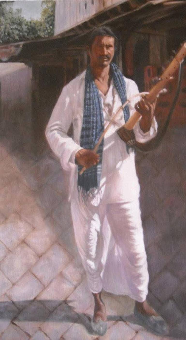This realistic painting portrays a traditional Indian folk musician standing in a sunlit village street, playing a rustic string instrument. His confident posture, simple white attire, and deeply focused expression bring out the raw emotion and culture pride of rural India.