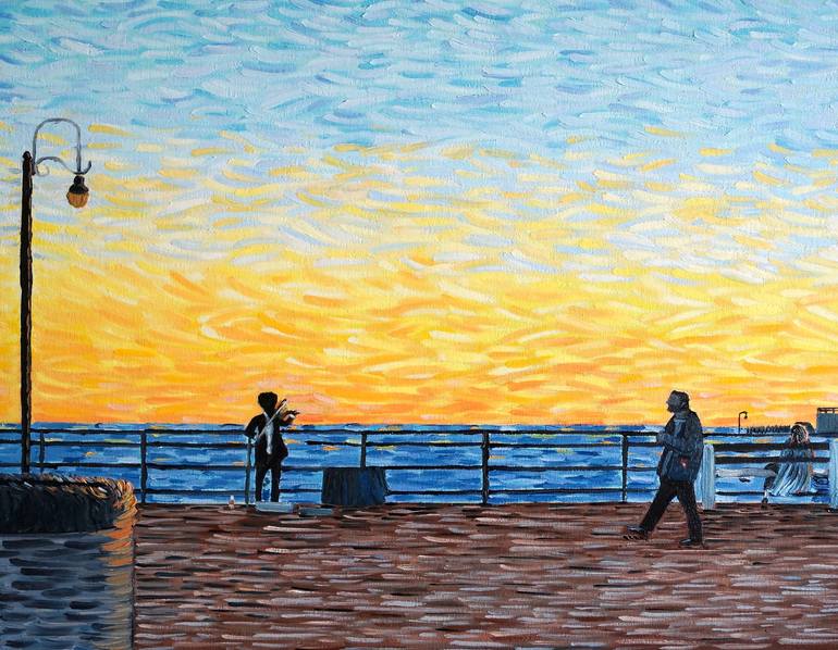 In this scene, a violinist plays music on a beautiful sunset evening on Santa Monica Pier located in Los Angeles, California. The music from the violinist is in perfect harmony with the colors of the sunset that are unique to L.A. In the foreground, a man walks by and his attention is caught by the ...