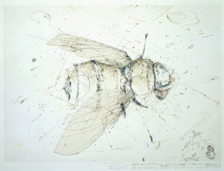Vorobyev comments, 'apart from being the man, who sets postal stamps on fire within my works, I also call myself a connoisseur of the secret life of insects. The Vorobyev’s fly was drawn by looking at the real fly with battered wings and legs. If you look closely, you can see my portrait drawn on t...