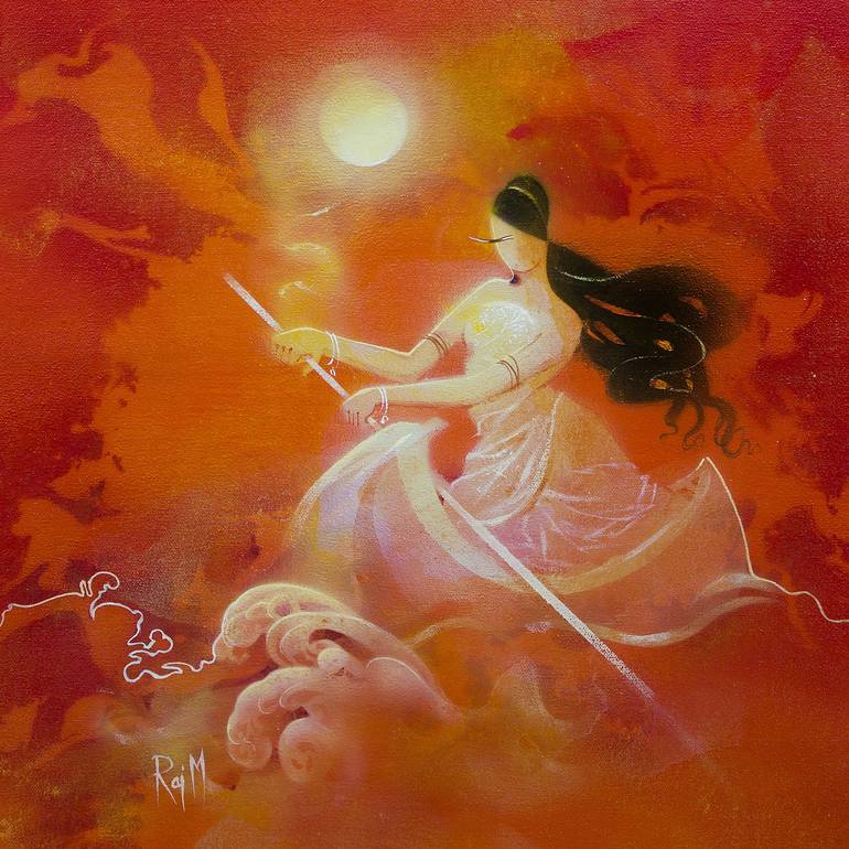 This painting is inspired by the inner journey of the soul which is trying to find the The Light, the Origin of it sailing through the waves of life. The Red environment is giving the suggestion of the physical universe. This is a contemporary Indian art. The painting is framed by a black softwood f...