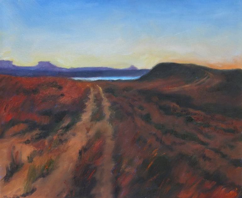 A rugged path invites the viewer to enter the landscape and take a walk towards the water and the sunset. This painting is done in oils on professionally stretched canvas. It is unframed, the edges are neatly painted and it is strung, ready for hanging.