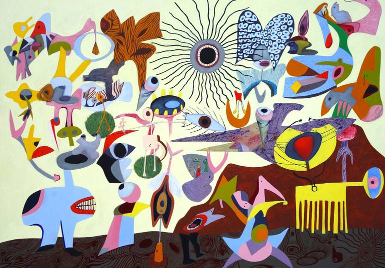 Pale yellow sky. A Screaming circle. Even the Earth has strange visions. This painting is not framed. The sides of the painting are unpainted.