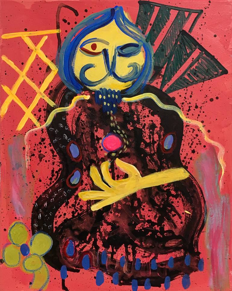 I employ bright colors and shapes with acrylics that immediately grab the eye. My work is a bold and memorable display with colors used in signage to noticeably capture an otherwise forgotten moment. The loud colors represent femininity, courage and strength in a modern world. Perhaps related to not wanting to let go of a memory and the desire to be remembered. I am inspired by the vibrant colors and patterns of folk art and crafts. Although color takes precedence in these paintings. Shape interaction and patterns play an important role. They are like rhymes that harmoniously flow through my compositions. My images are dreamy fantasies transforming the subconscious to another place I also think about the autonomous drawings of the surrealist or drawing without conscious thought. Regardless of the common domestic plots there is nothing completely ordinary in my world of painting. They bravely incorporate a carefree style. One moment of creation may not necessarily be safely carried to the next painting. My work has a range of figures, symbols, patterns that switch from recognizable to abstraction. This arrangement exudes a surreal dreamlike quality. The paintings weave in and out of my dreams. They dive into the mind and bounce out to bold world of art. Fantasy transforming into materiality. Ultimately I like to think of how my artwork and femininity takes place in the modern world. I channel memories, ancient wisdom and dreams of women from the past. My patterns and electric colors with dynamic shape interaction bring a new femininity, boldness and bravery, as we face the uncertain future.