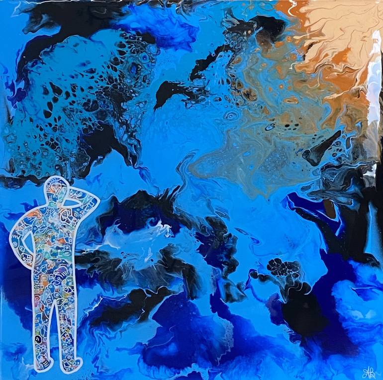 My painting technique can be compared to the looking for images in the clouds. I begin with a blank canvas and as I layer on the initial coat of paint to create textures and colours, I start to see shapes and figures emerge from the paint. This is the foundation from which my paintings develop. With the freedom open-minded approach brings, my painting takes on a life of its own. From the images I initially see, my paintings take on stories, issues, and experiences to which others can relate. I encourage to read the story behind or developed with the work. When you look into my work, you will see the story falling into place. With this work you can also create your own story! I am currently working on “Common Man” series. The main subject in each piece ,“Our Hero”, depicts the daily life of a person in different scenarios. Some of the paintings represent everyday tasks like running or dog walking. Others show the more adventurous side such as his “Cliffhanger” or “Ropewalker” pieces, while others show the challenges and pressures in as seen in his “Rising Corporate Ladder” painting.