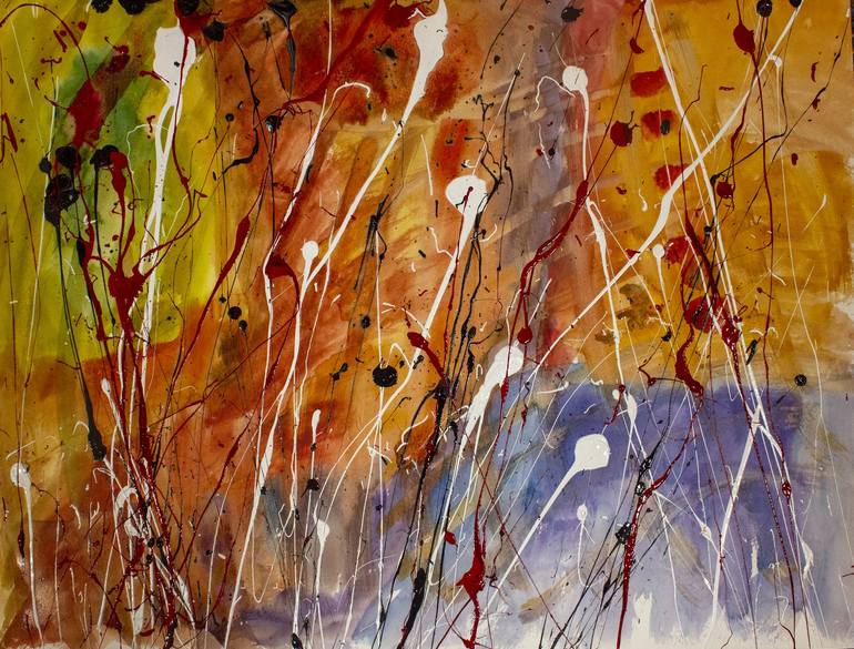 This abstract painting is brought to life through the fusion of watercolors and acrylics, offering a striking juxtaposition of elements. The background is a harmonious blend of warm hues, including oranges, reds, purples, and a hint of green, creating a vivid backdrop. In contrast, the foreground bu...