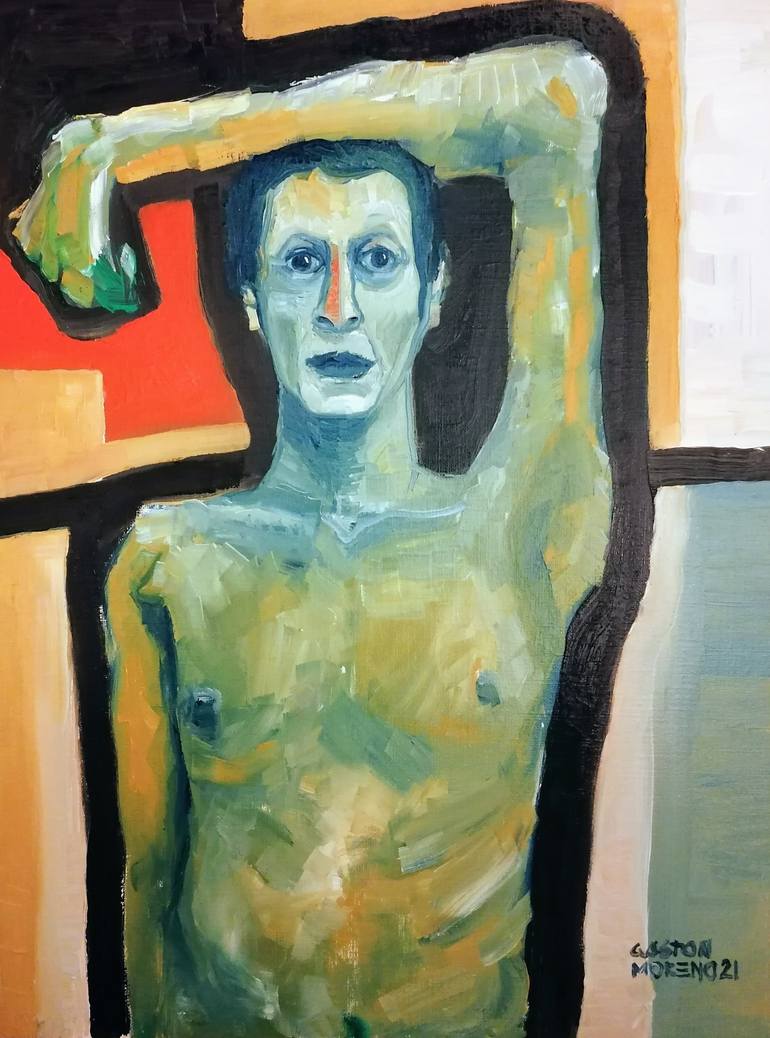 pintura al oleo sobre papel en estilo expresionista abstracto, representa a un hombre de frente con el brazo en la cabeza