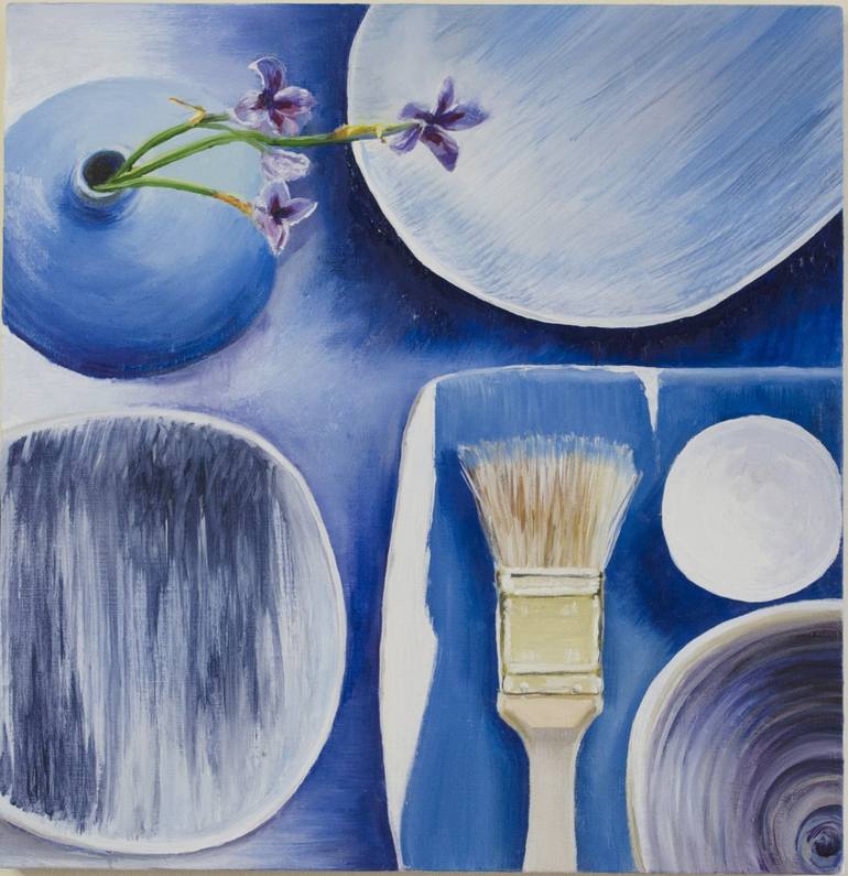 The blue calm composition in oil on high quality linen canvas, 11.8"x11.8" (30x30cm). This meditative almost geometric composition shows simple things put together but contains the value and joy of those for whom these things are important. This composition contains the meaning of simple things for...
