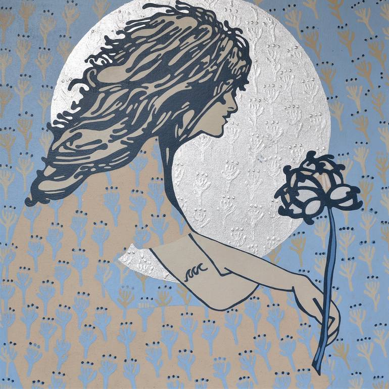 The blue flower as a symbol of power and strength to face new stages in life. I paint day by day, my world Acrylic, linen glued to table on frame. Acrylic varnish