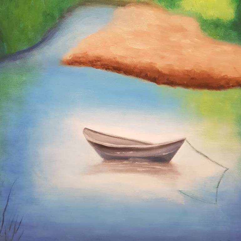 Oil on wood work done with oil. A lonely boat in the middle of the lake