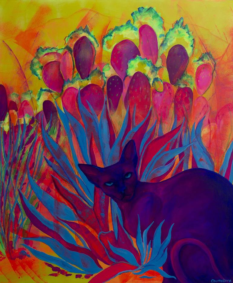 Oksana Chumakova (The cat is watching you), 2023. Canvas, acrylic, pastel Size 120/100 cm.