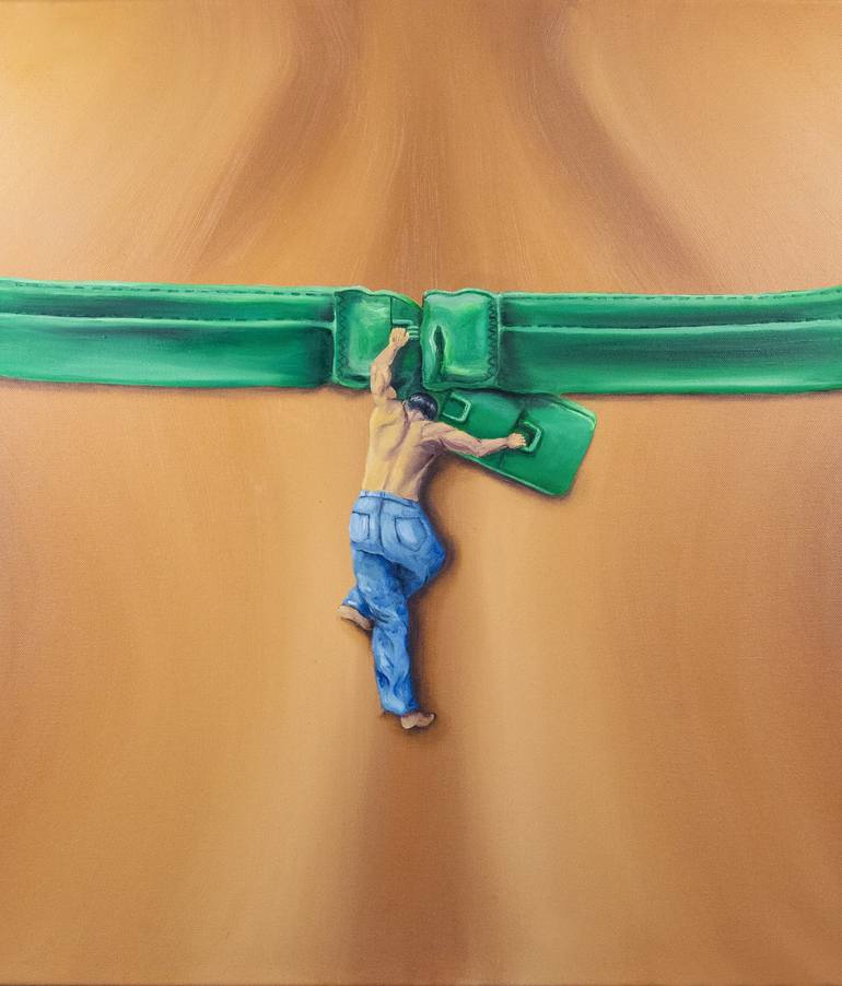 At the center of the canvas, we are introduced to an extraordinary juxtaposition of scale – a tiny, determined man, reminiscent of a daring mountaineer, is hanging onto the colossal brassiere of a giantess. It is as though he is scaling the precipitous cliffs of a new, enticing world, where the ordi...