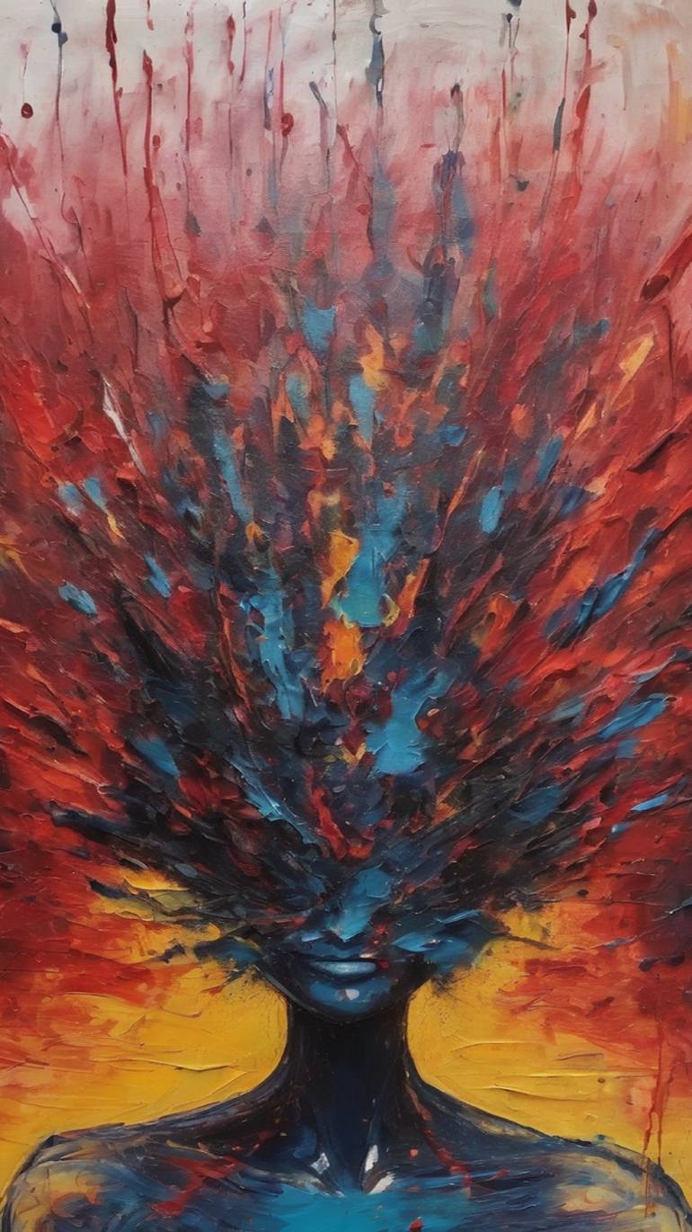 "The creative explosion"– Bursts of bright colors, like red, blue and yellow, explode from the canvas, evoking an explosion of creativity. The abstract shapes seem to come to life, creating a sensation of energy in perpetual motion.