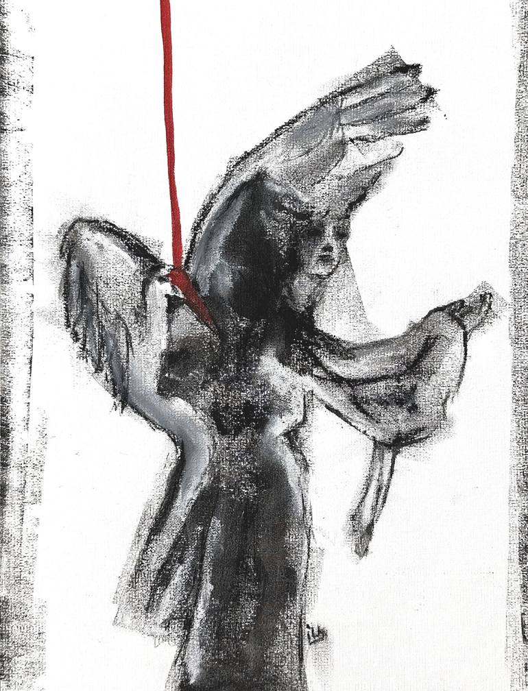 The painting "Dance of the Crane and the Feminine" in black and white is harmony captured on canvas. Acrylic creates a saturated background that serves as a stage for fine and graceful lines drawn in oil pastel. Two main elements are depicted in the center of the composition: a majestic crane, its w...