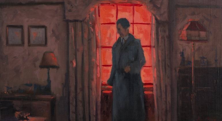 This work represents a pictorial experiment in which the artist seeks to break away from their usual style. The scene depicts a figure dressed to go out, evoking the elegance of the 1920s. It is set in an English-style interior, with a window allowing red light from the street to enter, giving the a...