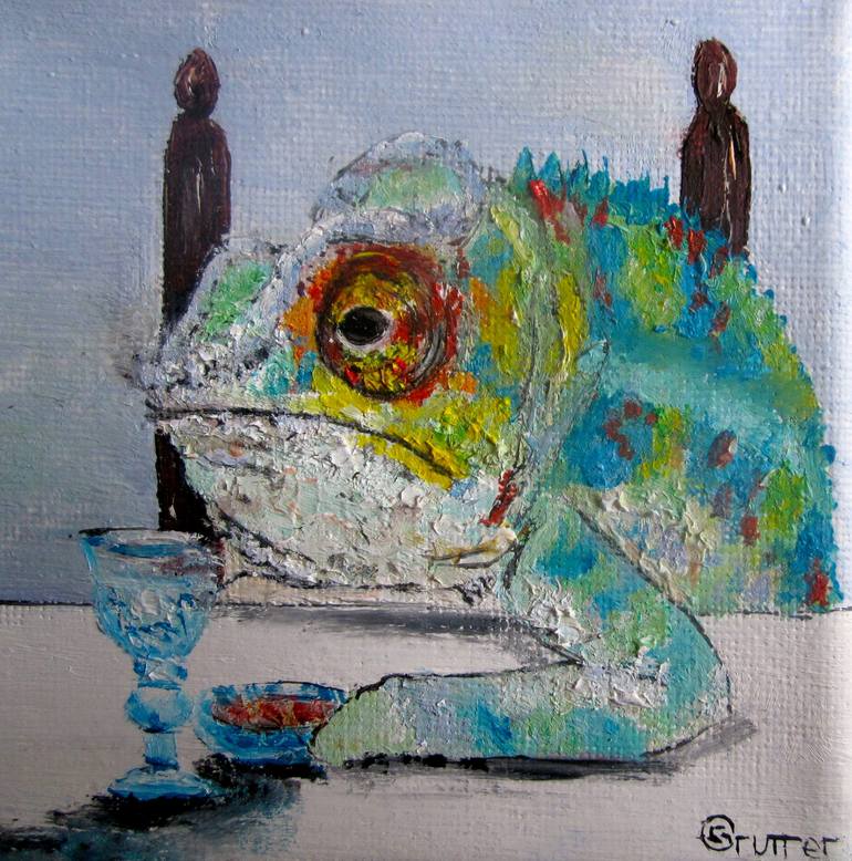 Painting: Oil on Canvas. The chameleon is part of a series of animals sitting at a dinner table. The idea just came to me, maybe inspired by children's books, like Alice in Wonderland, who knows? Painting those animals made me smile. They all have their own character and together they would make lo...