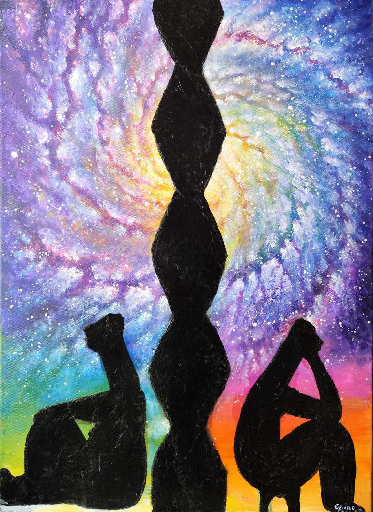 My painting of 3 iconic sculptures from the Romanian culture and history, the endless column by Constantin Brancusi, the thinker, and the relaxing woman