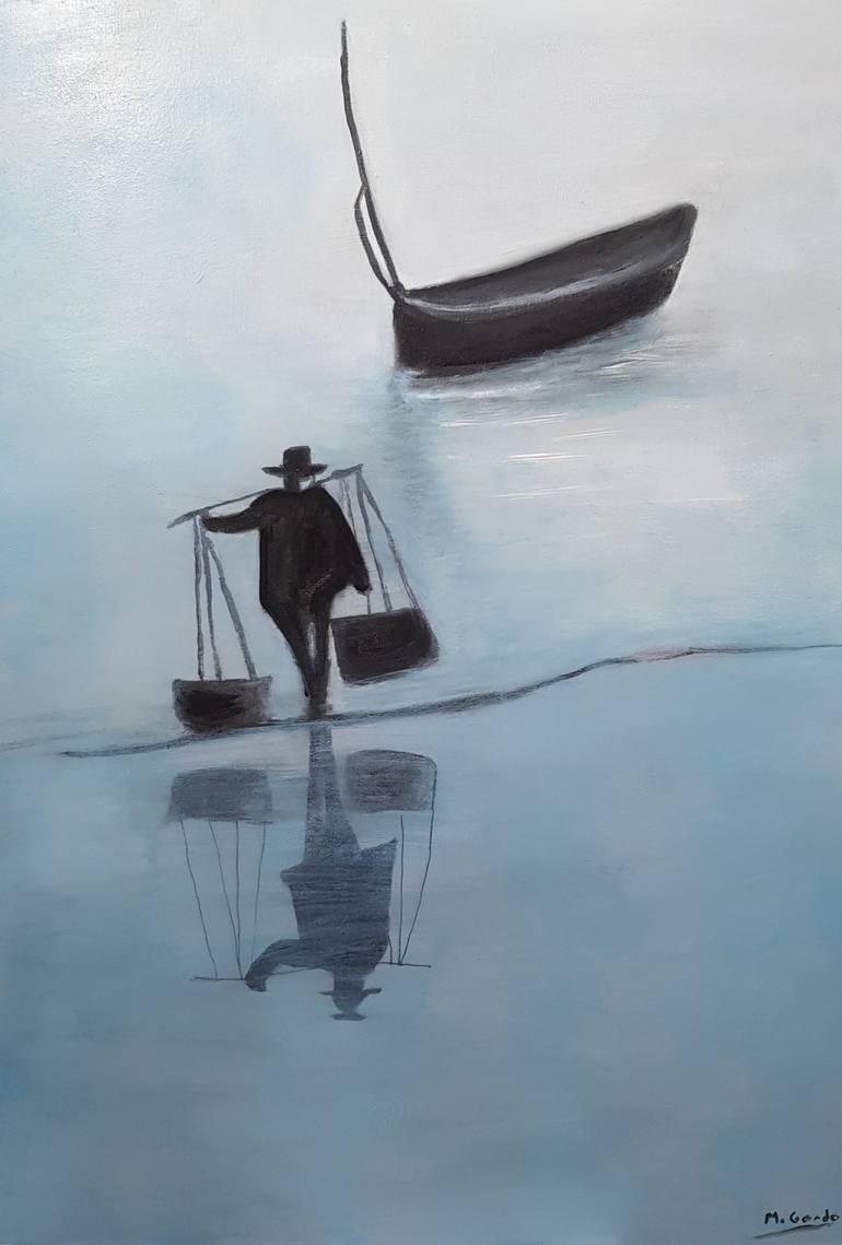 Oil on wood Second work of the collection of paintings of fishermen in a lake. I have worked with glazes to highlight the transparency of the water